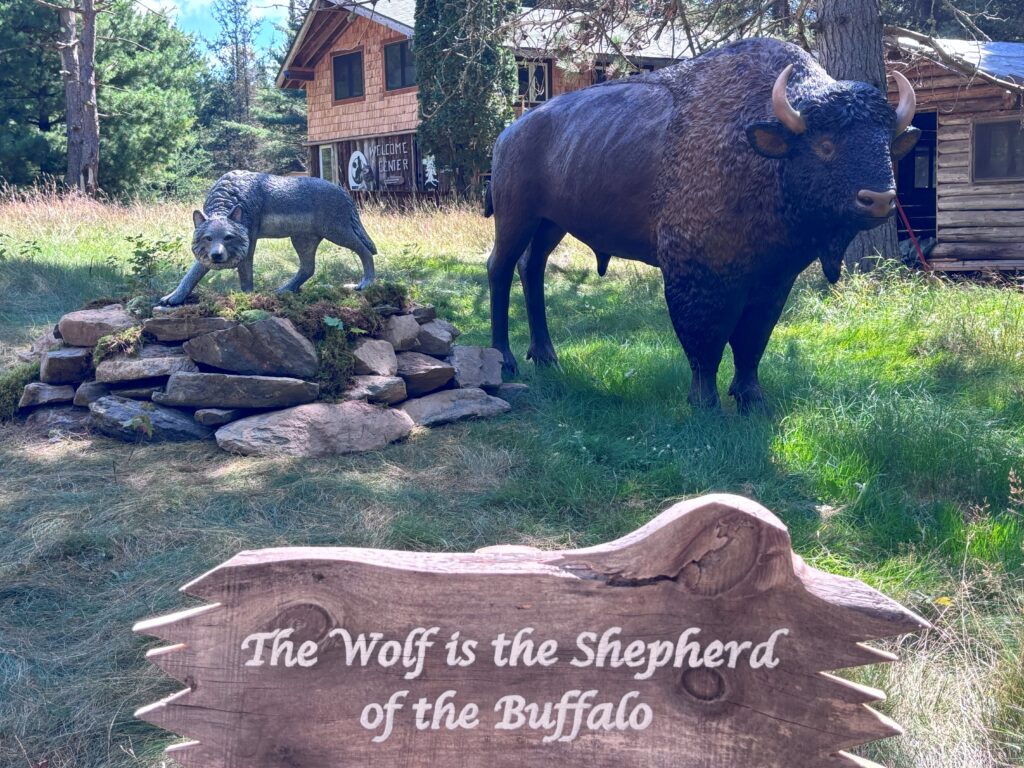 Yet something was missing. There is a saying, “The Wolf is the shepherd of the Buffalo,” which was meaningful to Tamarack because it honored the Wolf-Buffalo relationship, so he and Fox posted a sign with the saying in front of the Buffalo. Only one thing was missing from the scene: the Wolf.