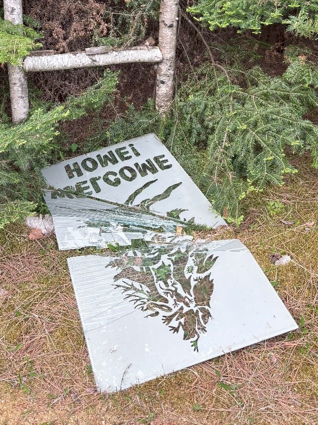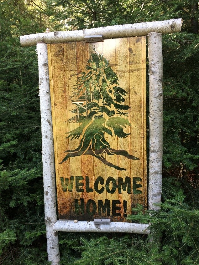 On the morning Tamarack woke up with his original inspiration, we found the glass “Welcome Home!” sign at the start of the Healing Nature Trail shattered in a thousand pieces on the ground. The prior night was calm, and we could find no clue as to how or why the panel fell from her Birch log frame.