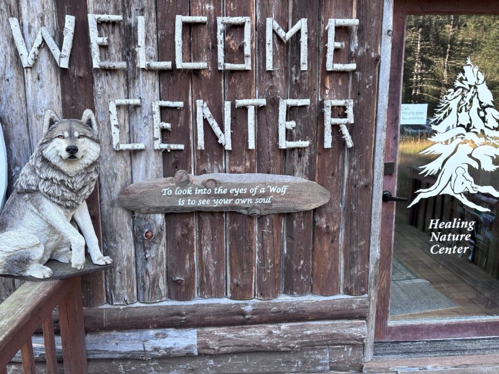 He came home with us that evening, having a back seat to himself and being properly seat-belted in. Now, mounted beside him where he serves as sentinel beside the Welcome Center door is the quote that so profoundly inspired Tamarack to dedicate his life to helping renew the sacred Wolf-Human relationship.